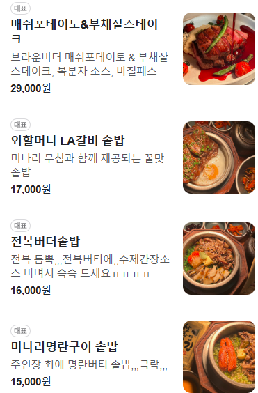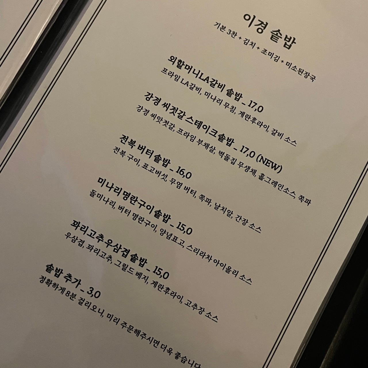 메뉴판을 보면 독특한 메뉴 이름이 눈길을 끄는데요, 그 중에서도 외할머니 LA갈비 솥밥, 강경 씨젓갈 스테이크솥밥 등 솥밥 이름이 아주 구~~~수한 느낌이 많이 나는 메뉴들입니다.